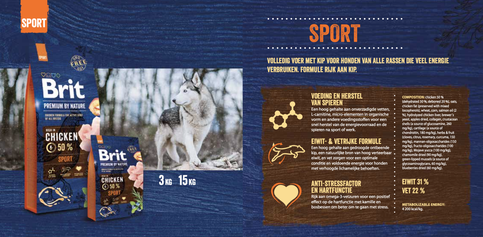 VOEDINGSADVIES: kan droog worden gegeven of bevochtigd met lauw water. geschikt voor honden met een hoog energieverbruik ? de aanbevolen dagelijkse hoeveelheid voer die in de voedingstabel vermeld staat, moet worden verdeeld over een aantal kleinere porties afhankelijk van de inspanning van de hond ? pas de dagelijkse verhouding aan de activiteit aan. De aanbevolen dagelijkse hoeveelheid staat vermeld in de voedingstabel. Geef kleinere hoeveelheden en vermeng met het vorige voer wanneer Brit Premium voor de eerste keer wordt gegeven; verhoog geleidelijk de hoeveelheid Brit Premium. Zorg ervoor dat er altijd voldoende schoon water klaarstaat voor uw hond.