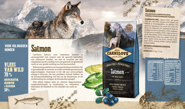 Samenstelling: zalmmeel (25%), zalm graatvrij (20%), gele erwten (20%), haringmeel (10%), kippenvet (met tocoferolen als conserveringsmiddelen, 9%), kippenlever (3%), appels (3%), tapiocazetmeel (3%), zalmolie (3%), wortels (1%), lijnzaad (1%), kikkererwten (1%), gehydrolyseerde schalen van schaaldieren (een bron van glucosamine, 0,026%), kraakbeenextract (een bron van chondroïtine, 0,016%), biergist (een bron van mannan-oligosachariden, 0,015%), cichoreiwortel (een bron van fructo-oligosachariden, 0,01%), Yucca schidigera (0,01%), algen (0,01%), psyllium (0,01%), tijm (0,01%), rozemarijn (0,01%), oregano (0,01%), veenbessen (0,0008%), bosbessen (0,0008%), frambozen (0,0008%).